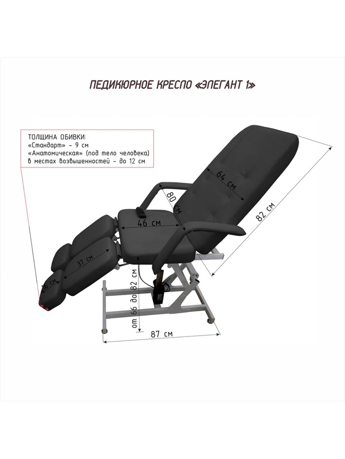ПРЕМИАЛЬНАЯ обивка — Многослойная система с увеличенной толщиной мягкого слоя до 12–14 см обеспечивает более мягкую, но при этом плотную и устойчивую посадку. Кресло сохраняет форму даже при длительной эксплуатации и снижает нагрузку на тело во время процедур. Спинка и сиденье имеют рельефную форму с поддержкой поясничной и паховой зон. Это улучшает посадку, предотвращает «скатывание» вперёд и обеспечивает комфортное положение тела во время процедур. Задняя часть кресла выполнена из экокожи и дополнена декоративными накладками на каркас, что придаёт модели более аккуратный, премиальный внешний вид. Покрытие — нескользящая, износостойкая «дышащая» экокожа премиального качества (Турция). Рельефная поверхность выглядит более выразительно и подчёркивает статус кресла. Ножная часть оснащена механизмом удлинения до 15 см. Ширина ложа — 64 см, длина — 185 см, толщина мягкого слоя — 9–12 см. Съёмные подлокотники. Педикюрное кресло «Элегант 1» Стабильность. Надёжность. Продуманная механика. «Элегант 1» — профессиональное кресло для мастеров, которые ценят устойчивость и удобство в работе. Каждая деталь модели обеспечивает уверенное положение клиента и комфорт мастера на протяжении всей процедуры. Кресло оснащено одним электроприводом для регулировки высоты. Наклон спинки и ножных частей регулируется механически, позволяя точно подстраивать кресло под клиента и процедуру. Для максимальной устойчивости верхняя платформа установлена на пантографическом механизме, а дополнительный подъёмный рычаг сохраняет полную стабильность головной части даже в верхнем положении кресла — оно не раскачивается во время работы. Рабочая высота кресла — 66–82 см. Спинка усилена металлической рамой, ножные части закреплены на прочных держателях, все соединения выполнены на винтовых креплениях. Усиленный механизм выдвижения пяточной части позволяет поднимать её на 20 см, обеспечивая удобный доступ к стопе и задней поверхности ноги. Кресло рассчитано на нагрузку до 220 кг, что подтверждает его профессиональный уровень и надёжность в ежедневной эксплуатации. Модель имеет декларацию соответствия, гарантируя безопасность, качество и соответствие установленным требованиям. «Элегант 1» — когда оборудование поддерживает мастера, обеспечивает стабильность и подчёркивает профессиональный уровень кабинета.