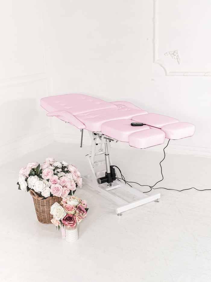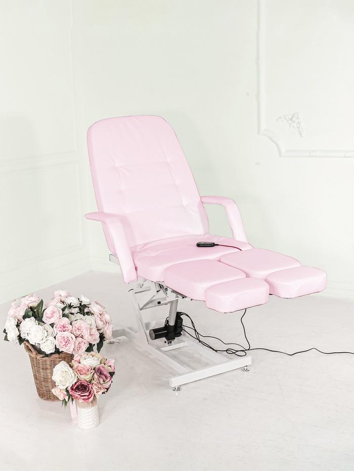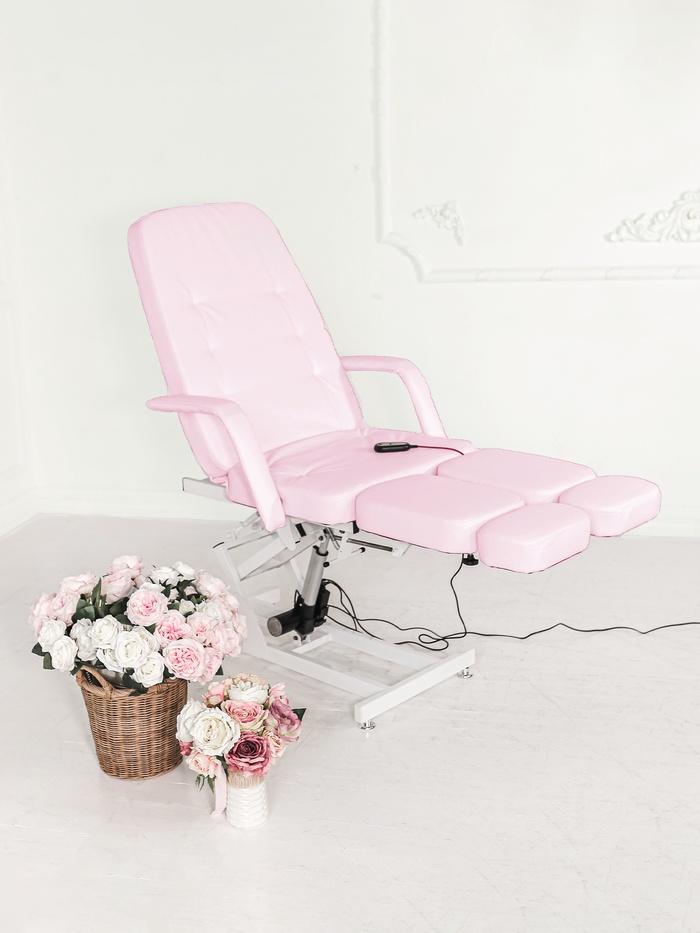 Кресло оснащено одним электроприводом для регулировки высоты. Наклон спинки и ножных частей регулируется механически, позволяя точно подстраивать кресло под клиента и процедуру.