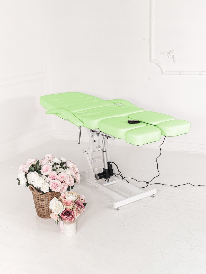 Кресло оснащено одним электроприводом для регулировки высоты. Наклон спинки и ножных частей регулируется механически, позволяя точно подстраивать кресло под клиента и процедуру.