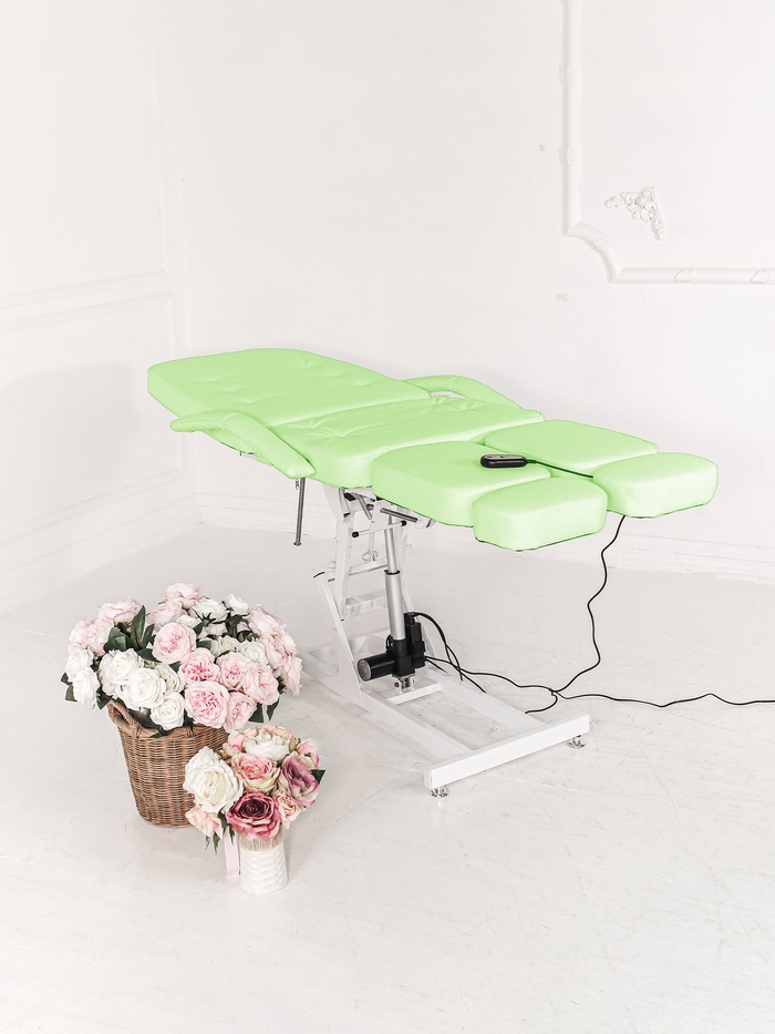 Кресло оснащено двумя электроприводами, которые отвечают за регулировку высоты и наклона спинки. Угол наклона спинки и ножных частей дополнительно регулируется механически, что позволяет точно адаптировать положение кресла под процедуру и анатомию клиента.
