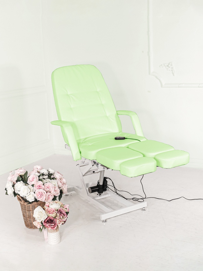 Кресло позволяет поднимать ногу клиента на высоту более 1,2 м, обеспечивая удобный доступ к зоне стопы и задней поверхности ноги. Усиленный механизм выдвижения пяточной части — до 20 см — делает модель особенно удобной для педикюрных и подологических процедур.