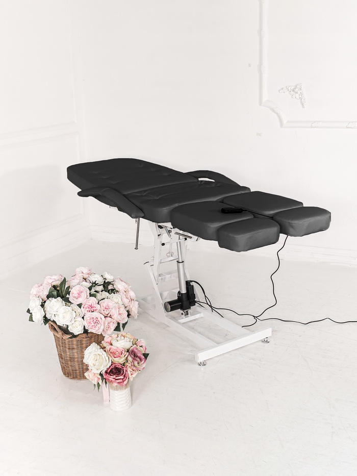 Кресло оснащено двумя электроприводами, которые отвечают за регулировку высоты и наклона спинки. Угол наклона спинки и ножных частей дополнительно регулируется механически, что позволяет точно адаптировать положение кресла под процедуру и анатомию клиента.
