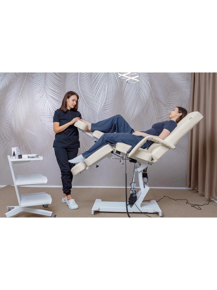 Кресло оснащено тремя электроприводами, позволяющими точно регулировать высоту, наклон спинки и подъём сиденья. Плавная настройка помогает быстро адаптировать положение под клиента и процедуру, сохраняя комфорт и правильную рабочую позу мастера.
