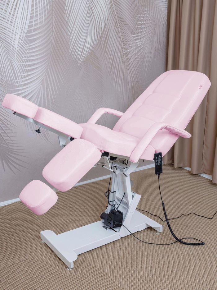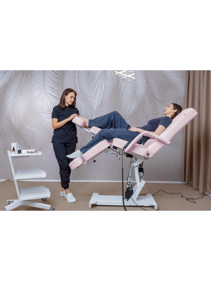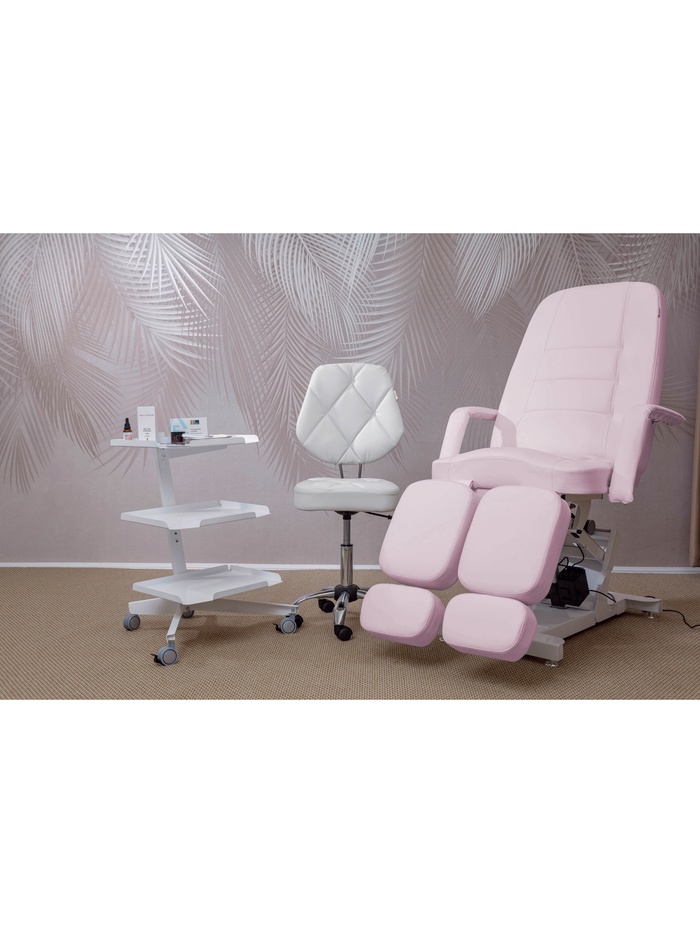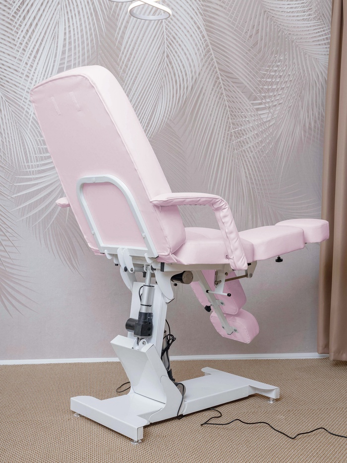 Кресло оснащено тремя электроприводами, позволяющими точно регулировать высоту, наклон спинки и подъём сиденья. Плавная настройка помогает быстро адаптировать положение под клиента и процедуру, сохраняя комфорт и правильную рабочую позу мастера.