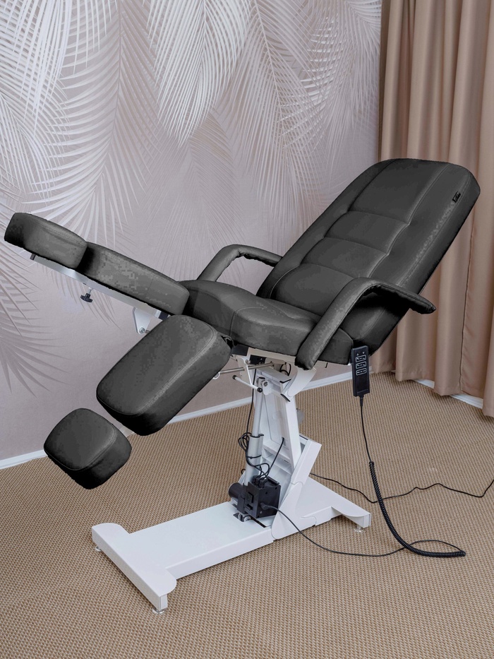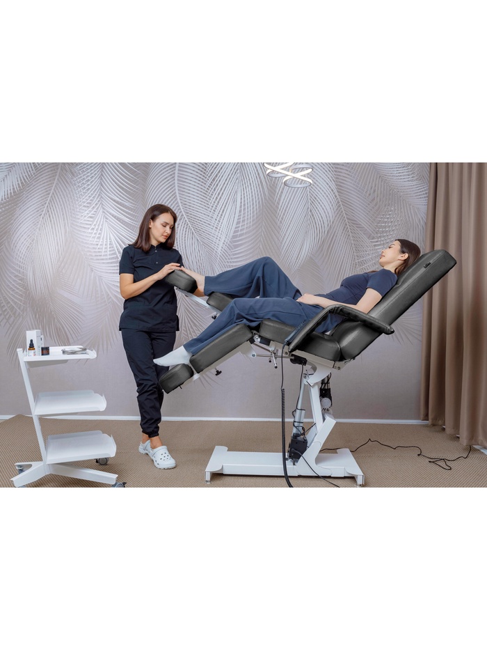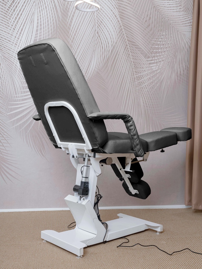 Кресло оснащено тремя электроприводами, позволяющими точно регулировать высоту, наклон спинки и подъём сиденья. Плавная настройка помогает быстро адаптировать положение под клиента и процедуру, сохраняя комфорт и правильную рабочую позу мастера.