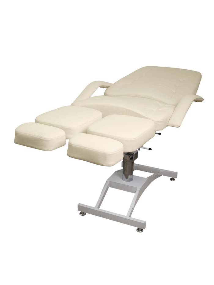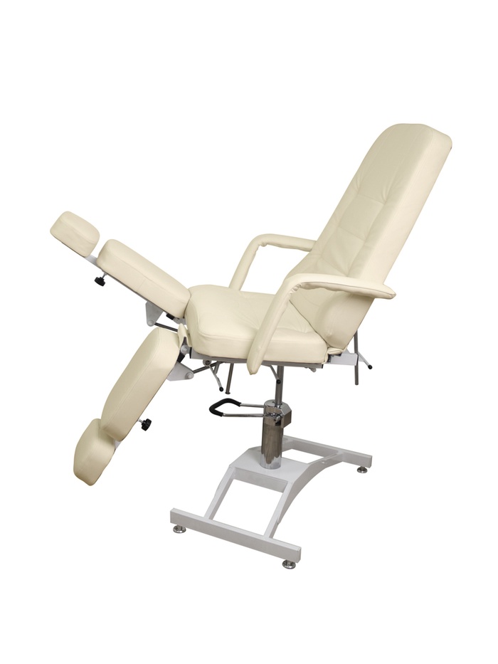 Кресло оснащено гидравлической регулировкой высоты (66–82 см), что позволяет точно настроить положение клиента под формат процедуры.