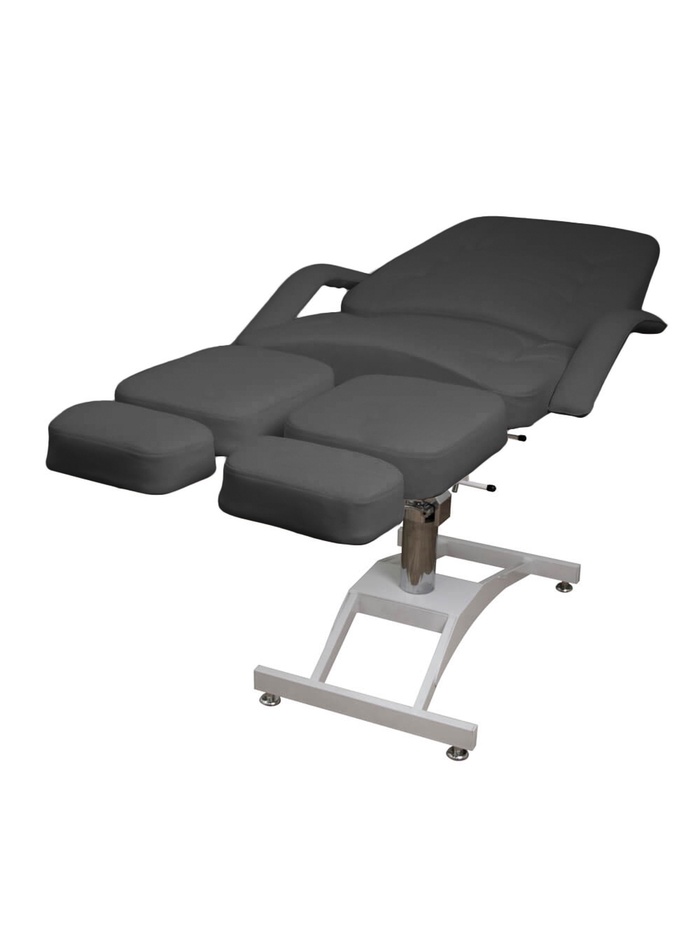 Кресло оснащено гидравлической регулировкой высоты (66–82 см), что позволяет точно настроить положение клиента под формат процедуры.