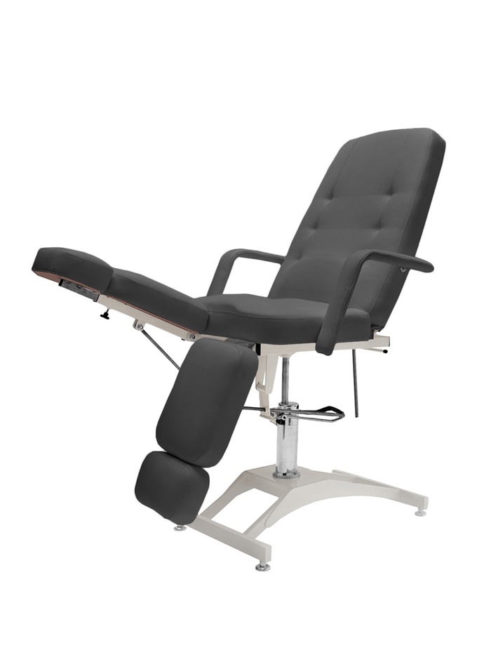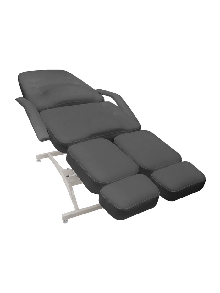 Кресло оснащено выдвижными пяточными частями и быстросъёмными подлокотниками, что обеспечивает удобную посадку клиентов с разной комплекцией и ростом.