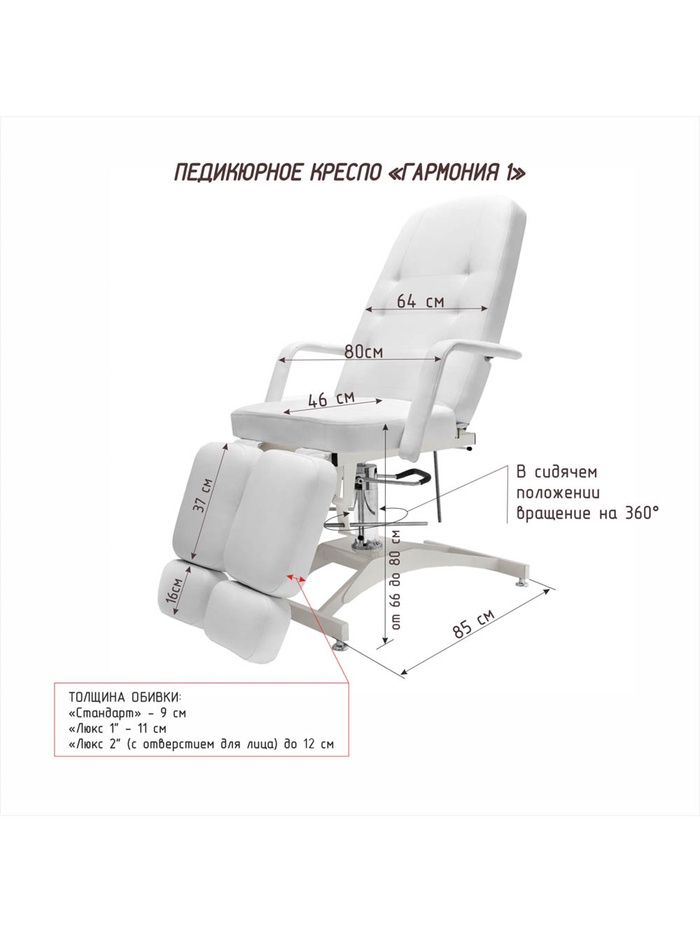 Обивка СТАНДАРТ — обивка имеет одинаковую толщину 9 см и плотность по всей длине ложа. Ножная часть оснащена механизмом удлинения (на 15 см). Покрытие не скользящая, высококачественная, износостойкая, «дышащая» экокожа производство Турции (50000 циклов, 100% РУ полиуретан). Ширина ложа 64 см, длина 185 см. Съемные подлокотники. Педикюрное кресло «Гармония 1» Свобода движения. Комфорт клиента. Удобство мастера. «Гармония 1» — педикюрное кресло с гидравлической регулировкой высоты и функцией вращения на 360°. Это идеальное решение для салонов, где важны эргономика, скорость работы и комфорт клиента. Главная особенность модели — возможность поворота кресла вокруг своей оси. Мастер может легко развернуть кресло к клиенту во время посадки и зафиксировать его в нужном положении. Это значительно упрощает работу и делает процесс обслуживания более комфортным и эстетичным. Гидроподъёмник обеспечивает плавную регулировку высоты в диапазоне от 66 до 82 см, позволяя точно настроить положение клиента под формат процедуры и рост мастера. Кресло оснащено выдвижными пяточными частями и быстросъёмными подлокотниками, что обеспечивает удобную посадку клиентов с разной комплекцией и ростом. Регулировка угла наклона спины и ножных секций — механическая, с надёжной фиксацией положения. Конструкция кресла усилена: ключевые узлы крепления спины и ног выполнены на прочных металлических держателях, интегрированных в основание кресла. Такое инженерное решение повышает долговечность конструкции и позволяет поднимать ножную часть на высоту более 1,1 м. Усилен механизм удлинения пяточной части — выдвижение до 20 см. Кресло рассчитано на нагрузку до 200 кг. «Гармония 1» — это баланс функциональности, надёжности и эстетики.