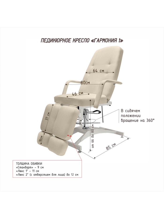 Обивка СТАНДАРТ — обивка имеет одинаковую толщину 9 см и плотность по всей длине ложа. Ножная часть оснащена механизмом удлинения (на 15 см). Покрытие не скользящая, высококачественная, износостойкая, «дышащая» экокожа производство Турции (50000 циклов, 100% РУ полиуретан). Ширина ложа 64 см, длина 185 см. Съемные подлокотники. Педикюрное кресло «Гармония 1» Свобода движения. Комфорт клиента. Удобство мастера. «Гармония 1» — педикюрное кресло с гидравлической регулировкой высоты и функцией вращения на 360°. Это идеальное решение для салонов, где важны эргономика, скорость работы и комфорт клиента. Главная особенность модели — возможность поворота кресла вокруг своей оси. Мастер может легко развернуть кресло к клиенту во время посадки и зафиксировать его в нужном положении. Это значительно упрощает работу и делает процесс обслуживания более комфортным и эстетичным. Гидроподъёмник обеспечивает плавную регулировку высоты в диапазоне от 66 до 82 см, позволяя точно настроить положение клиента под формат процедуры и рост мастера. Кресло оснащено выдвижными пяточными частями и быстросъёмными подлокотниками, что обеспечивает удобную посадку клиентов с разной комплекцией и ростом. Регулировка угла наклона спины и ножных секций — механическая, с надёжной фиксацией положения. Конструкция кресла усилена: ключевые узлы крепления спины и ног выполнены на прочных металлических держателях, интегрированных в основание кресла. Такое инженерное решение повышает долговечность конструкции и позволяет поднимать ножную часть на высоту более 1,1 м. Усилен механизм удлинения пяточной части — выдвижение до 20 см. Кресло рассчитано на нагрузку до 200 кг. «Гармония 1» — это баланс функциональности, надёжности и эстетики.