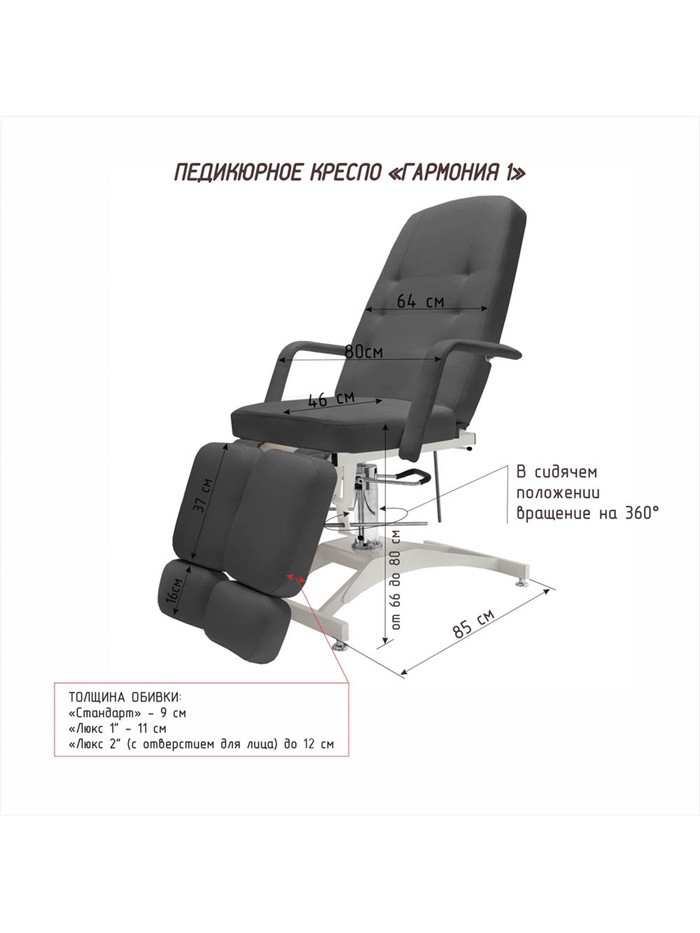 Обивка СТАНДАРТ — обивка имеет одинаковую толщину 9 см и плотность по всей длине ложа. Ножная часть оснащена механизмом удлинения (на 15 см). Покрытие не скользящая, высококачественная, износостойкая, «дышащая» экокожа производство Турции (50000 циклов, 100% РУ полиуретан). Ширина ложа 64 см, длина 185 см. Съемные подлокотники. Педикюрное кресло «Гармония 1» Свобода движения. Комфорт клиента. Удобство мастера. «Гармония 1» — педикюрное кресло с гидравлической регулировкой высоты и функцией вращения на 360°. Это идеальное решение для салонов, где важны эргономика, скорость работы и комфорт клиента. Главная особенность модели — возможность поворота кресла вокруг своей оси. Мастер может легко развернуть кресло к клиенту во время посадки и зафиксировать его в нужном положении. Это значительно упрощает работу и делает процесс обслуживания более комфортным и эстетичным. Гидроподъёмник обеспечивает плавную регулировку высоты в диапазоне от 66 до 82 см, позволяя точно настроить положение клиента под формат процедуры и рост мастера. Кресло оснащено выдвижными пяточными частями и быстросъёмными подлокотниками, что обеспечивает удобную посадку клиентов с разной комплекцией и ростом. Регулировка угла наклона спины и ножных секций — механическая, с надёжной фиксацией положения. Конструкция кресла усилена: ключевые узлы крепления спины и ног выполнены на прочных металлических держателях, интегрированных в основание кресла. Такое инженерное решение повышает долговечность конструкции и позволяет поднимать ножную часть на высоту более 1,1 м. Усилен механизм удлинения пяточной части — выдвижение до 20 см. Кресло рассчитано на нагрузку до 200 кг. «Гармония 1» — это баланс функциональности, надёжности и эстетики.