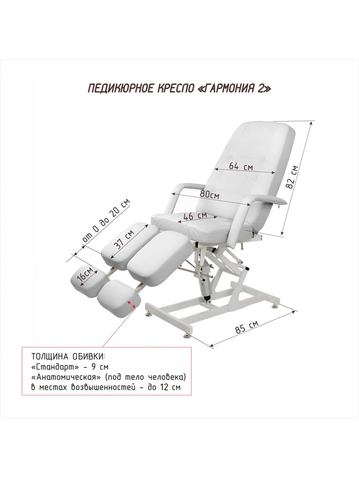 Обивка АНАТОМИЧЕСКАЯ — обивка повышенной комфортности (под тело человека), для длительного нахождения в кресле. Спинная часть и сиденье имеют в поясничной и паховой зонах возвышения. Возвышение в паховой зоне, в сидячем положении, позволяет человеку «не скатываться» вперед, а в поясничной части, осуществляет поддержку поясничной зоны мышц спины. Ножная часть оснащена механизмом удлинения (на 15 см). Покрытие обивки, не скользящая, высококачественная, износостойкая, «дышащая» экокожа производство Турции. Ширина ложа 64 см, длина 185 см, толщина от 9 до 12 см. Съемные подлокотники. Педикюрное кресло «Гармония 2»