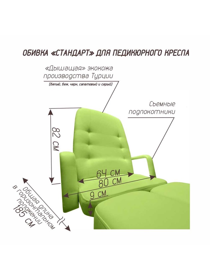 Покрытие не скользящая, высококачественная, износостойкая, «дышащая» экокожа производство Турции (50000 циклов, 100% РУ полиуретан). Ширина ложа 64 см, длина 185 см. Съемные подлокотники. Педикюрное кресло «Гармония 2»