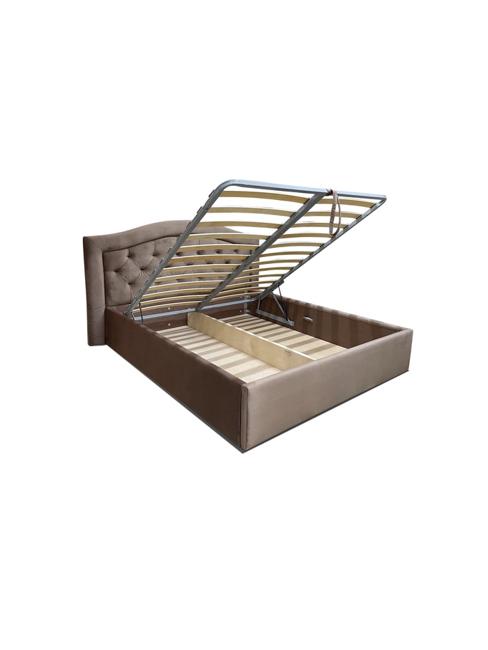 Классическая модель с мягким изголовьем и подъёмным механизмом. Мягкие элементы выполнены из высокоэластичного пенополиуретана. Декоративная отделка со стяжкой применяется только на изголовье.