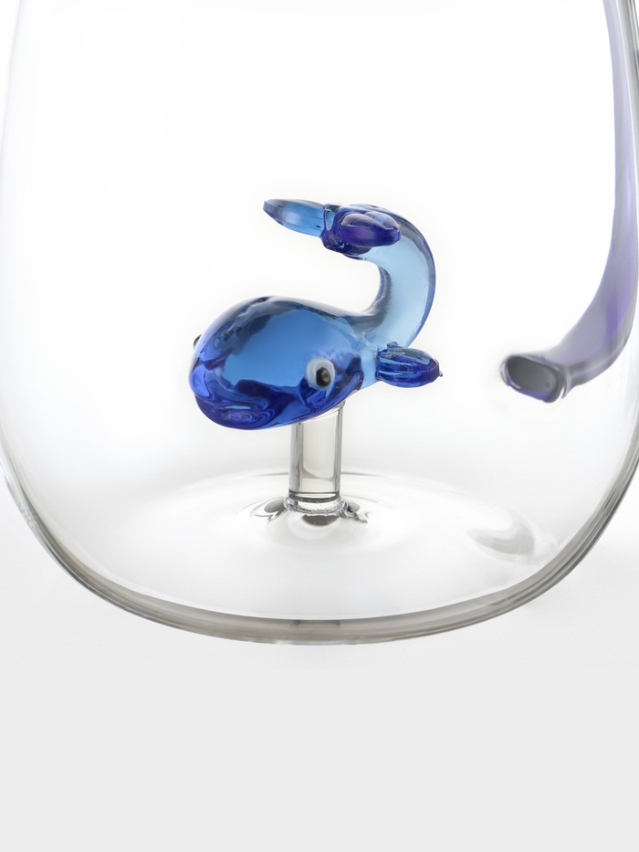 Прозрачное стекло подчеркивает детали оформления, а синяя фигурка внутри добавляет контрастности.