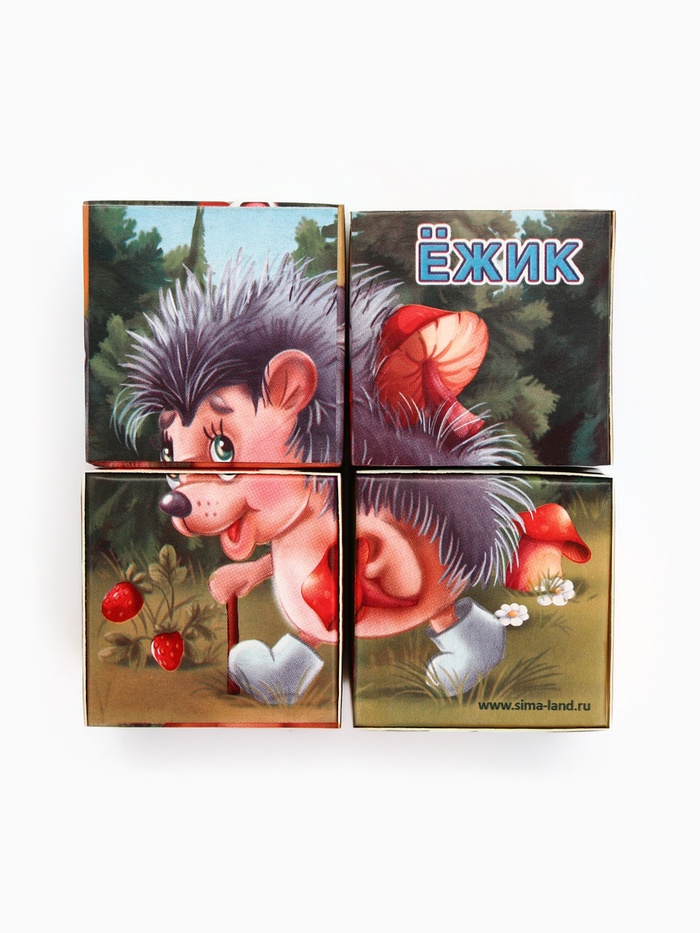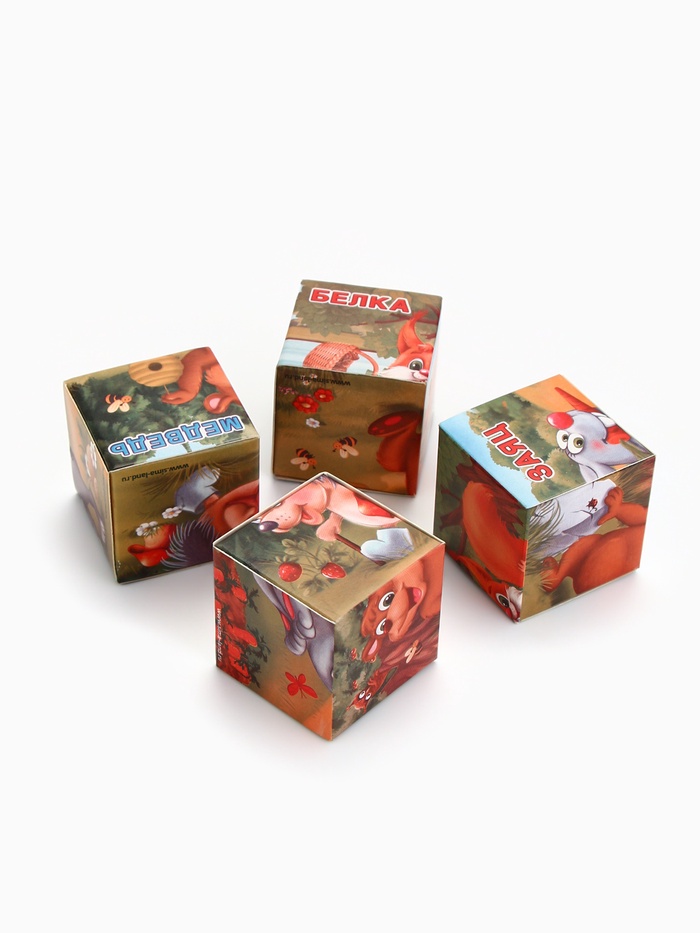 На каждой грани фигуры вы найдёте часть красочной иллюстрации с одним из лесных животных. Из кубиков можно сложить шесть картинок с разными зверятами! Здесь есть и весёлая белочка, и добрый медвежонок, и другие животные.