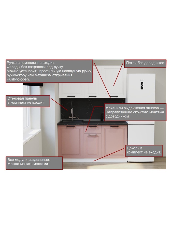 • Модульная конструкция: все элементы раздельные — можно менять местами под планировку кухни.
