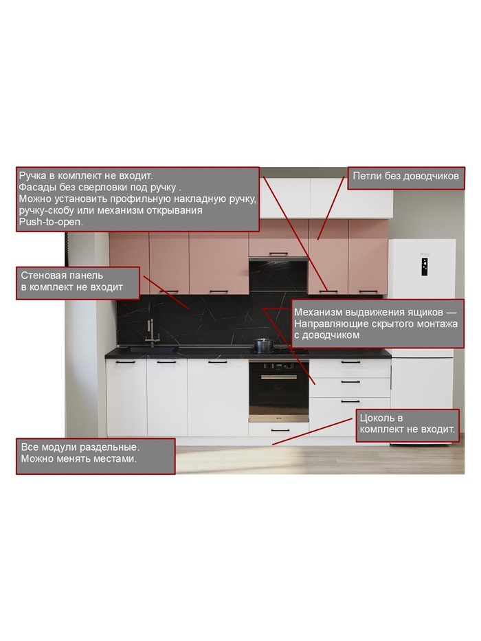 - Модульная конструкция: все элементы раздельные — можно менять местами под планировку кухни.