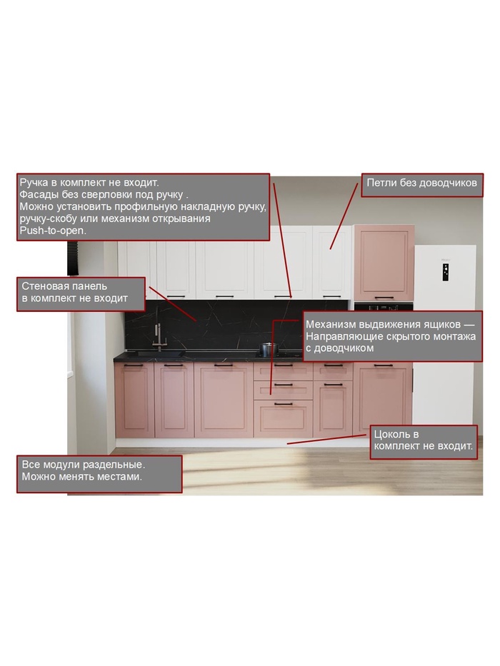 • Модульная конструкция: все элементы раздельные — можно менять местами под планировку кухни.