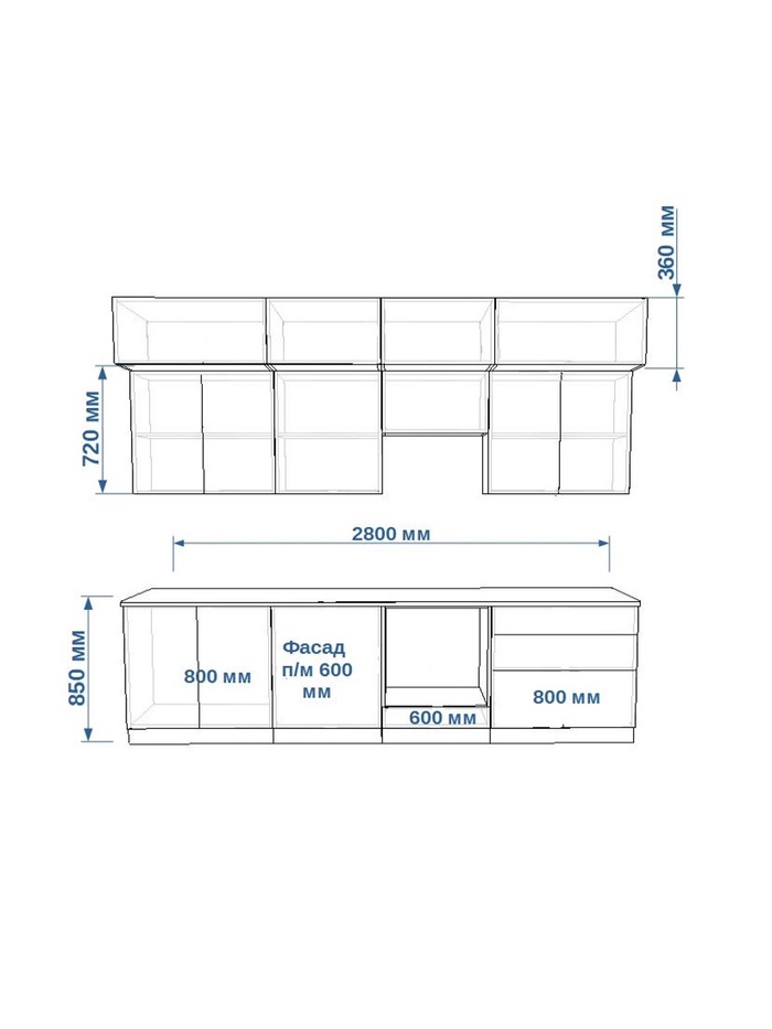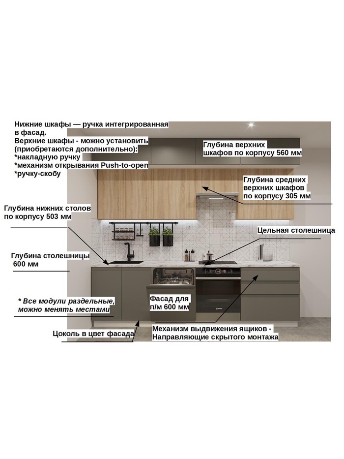 - Прямая планировка: удобное линейное расположение модулей для компактной и логичной организации кухни.