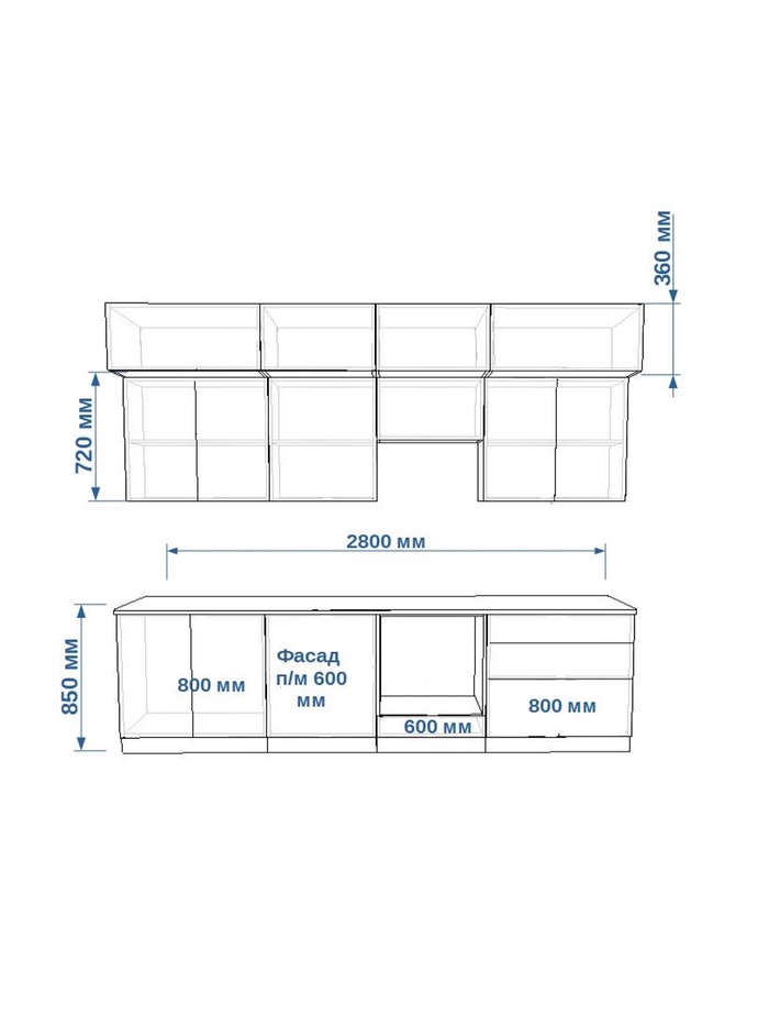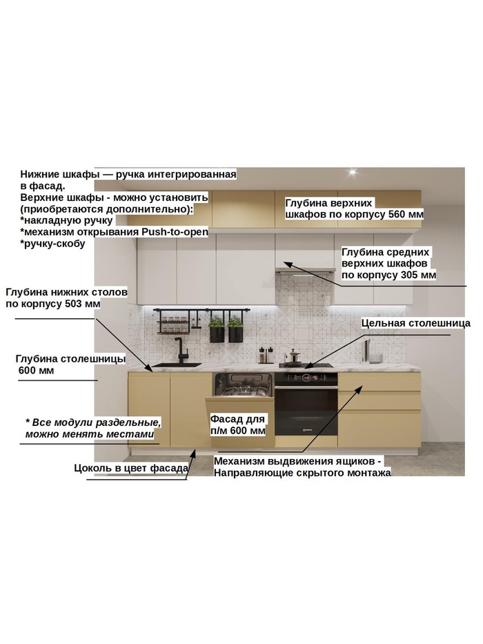 • Прямая планировка: удобное линейное расположение модулей для компактной и логичной организации кухни.