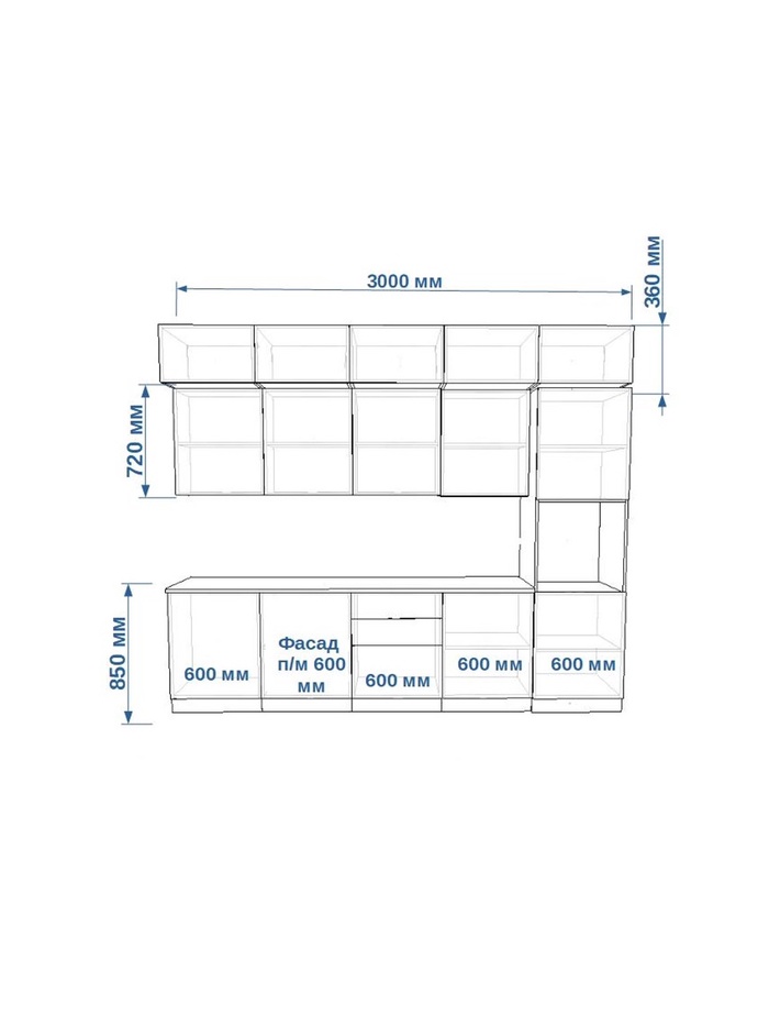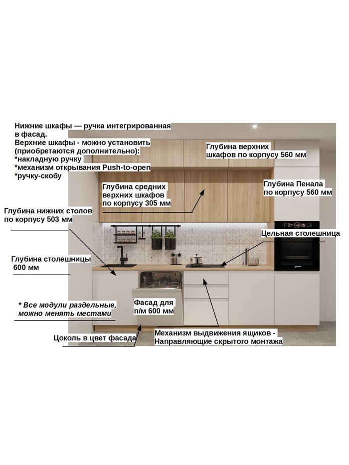 - Прямая планировка: удобное линейное расположение модулей для компактной и логичной организации кухни.