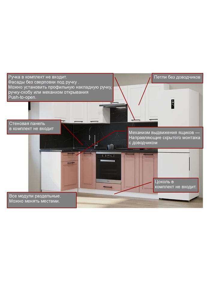 • Модульная конструкция: все элементы раздельные — можно менять местами под планировку кухни.