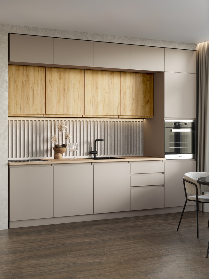 Воплощение современного дизайна, практичности и изысканности. Фасады в нежном оттенке кашемир в сочетании со столешницей в древесном оттенке создают гармоничное пространство, наполненное уютом и стилем. Продуманная конструкция до потолка позволяет кухне обеспечивать максимум места для хранения и подходит для современных интерьеров.