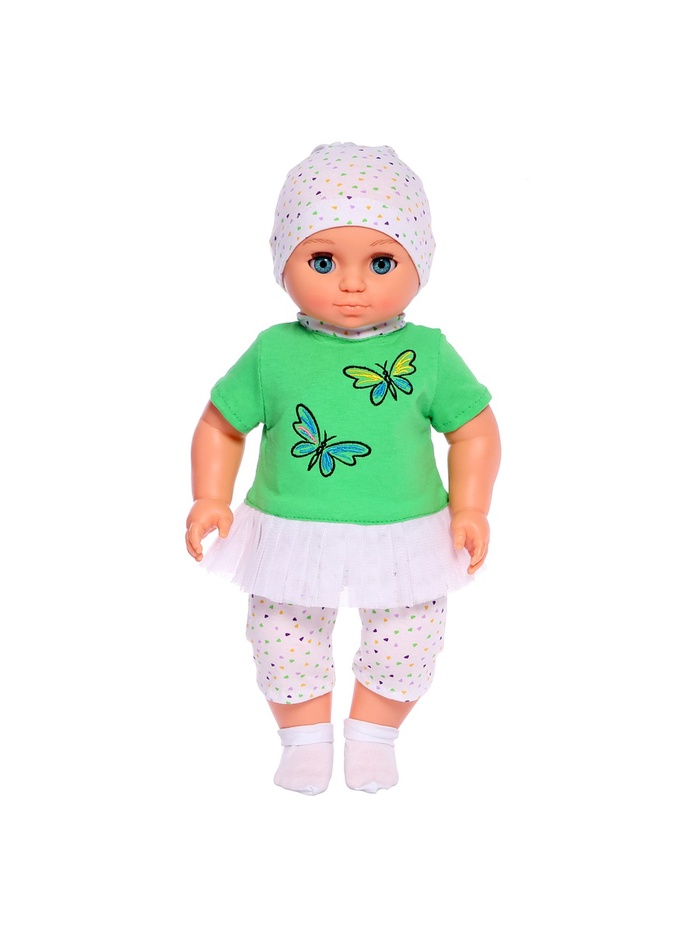 Кукла «Пупс 14» очень реалистична и похожа на настоящего ребёнка. В комплект входит трикотажная однотонная туника с короткими рукавами. Туника имеет обтачку горловины из цветного трикотажа, а также оборку по низу из мягкой сетки. Застегивается туника сзади на контактную ленту и на передней части имеет вышивку «Бабочки». В комплект также входят трикотажные разноцветные бриджи длиной чуть ниже колена, шапочка с отворотом и трикотажные носочки.