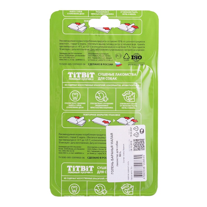 Содержит 8 бараньих голеней длиной 7 см. Гипоаллергенный белок, высокое содержание хрящевой и соединительной ткани. Изделие содержит кожу, много кости, жира, коллагеновой и соединительной ткани, а также прослойки мышечной ткани.