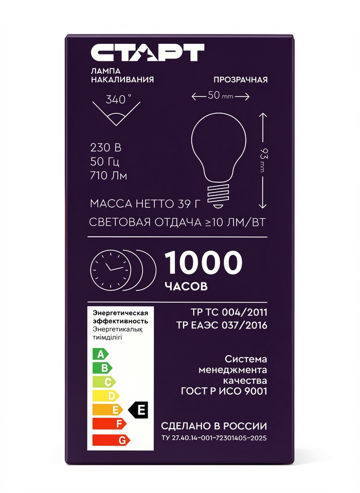 Лампа накаливания "Старт", Б, Е27, 60 Вт, 230 В