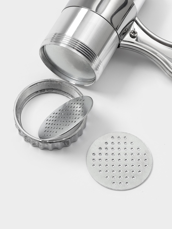 Насадка с круглыми отверстиями подходит для вермишели, диаметр отверстий: 2 мм.