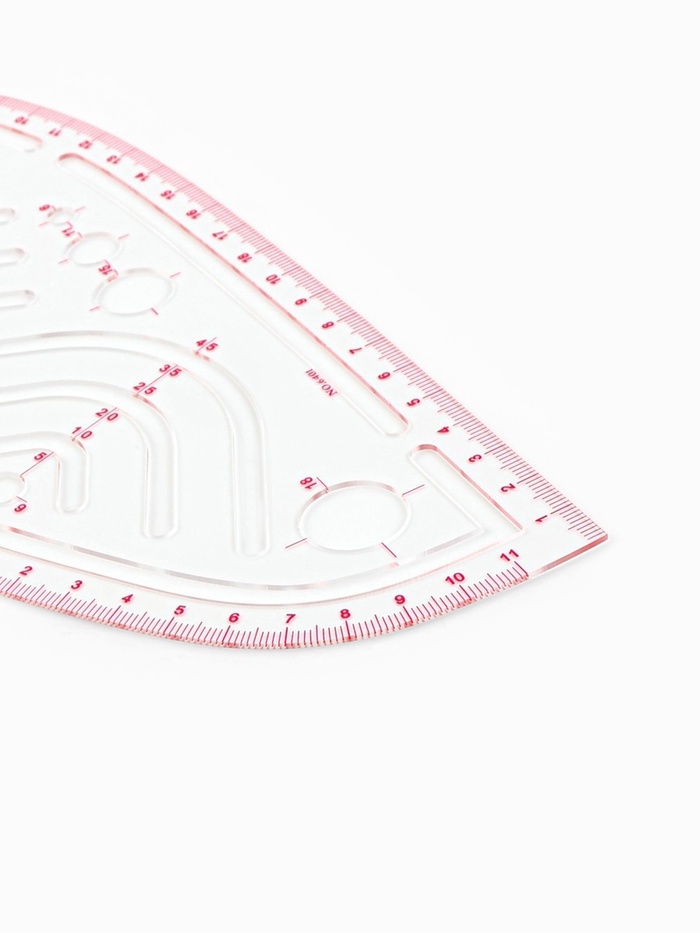 Лекало «Капля» идеально подойдёт для конструирования брюк, построения углов на воротнике, разметке припусков и петель. Круглая сторона станет отличным помощником для построения линий горловины, проймы, карманов, окружности под разметку пуговиц разного размера.