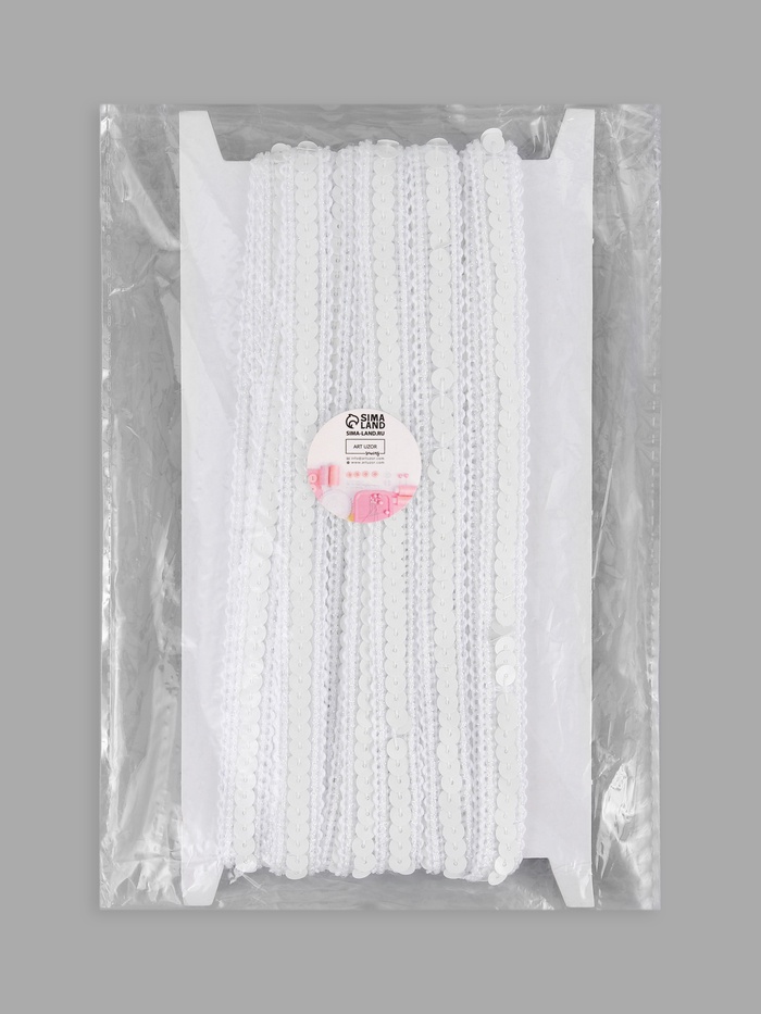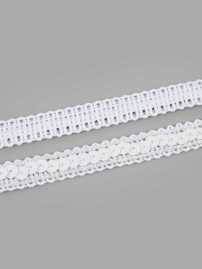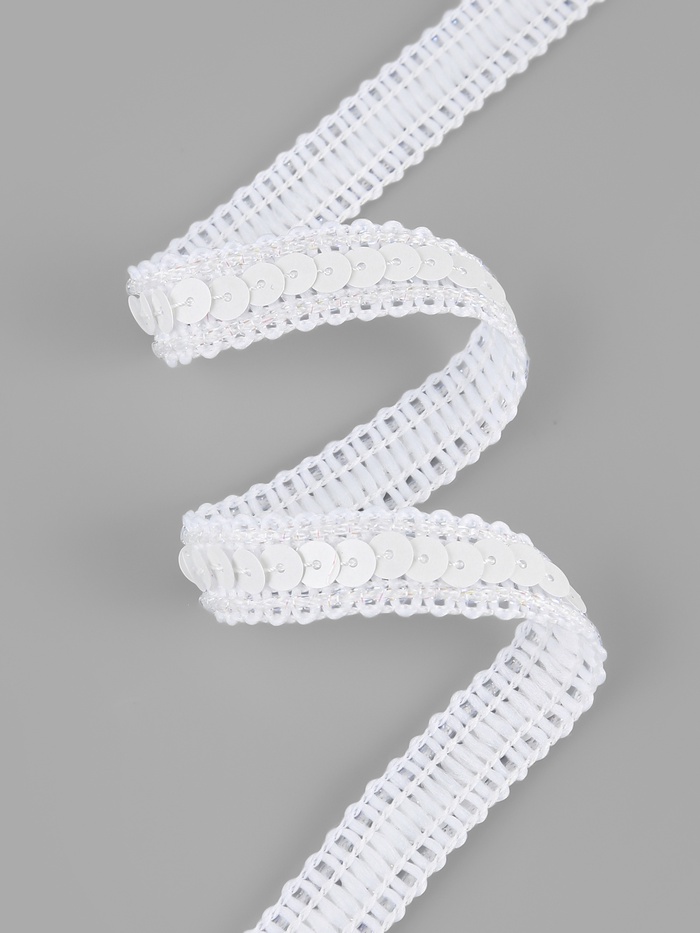 Белая лента гармонично сочетается с однотонными и контрастными тканями: на светлой основе создаёт эффект «чистого сияния», на тёмной — работает как чёткий графичный штрих. Пайетки аккуратно закреплены на текстильной основе, поэтому тесьма смотрится цельно и выдерживает регулярное использование в одежде и декоре.