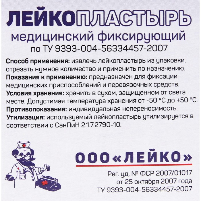 Лейкопластырь медицинский фиксирующий предназначен для фиксации медицинских приспособлений и перевязочных средств.