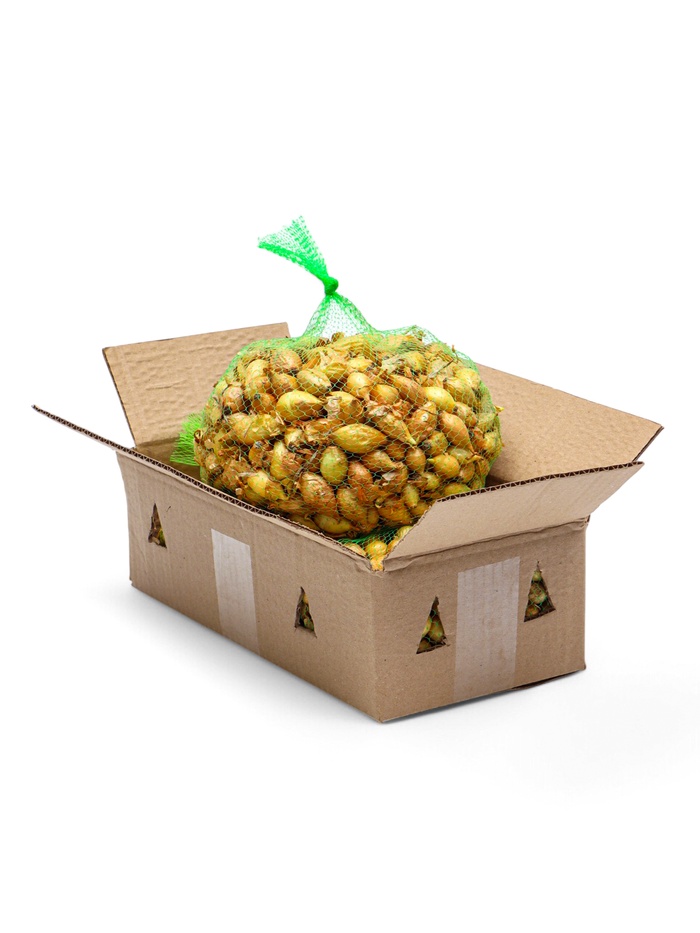 Сорт лука «Стурон» отличается крупными головками, масса которых при созревании может достигать 180–210 г. Сформированные зрелые луковицы имеют продолговатую эллипсовидную форму. Сверху они покрыты несколькими слоями плотной сухой чешуи характерного золотистого цвета с продольными светло-коричневыми полосами. Внутренние чешуйки плотные и сочные, белого цвета с едва заметным зеленоватым оттенком. Лук-севок «Стурон» имеет ярко выраженный запах и островато-горький пикантный вкус. Его используют при консервировании, употребляют в пищу как в обработанном, так и в свежем виде.