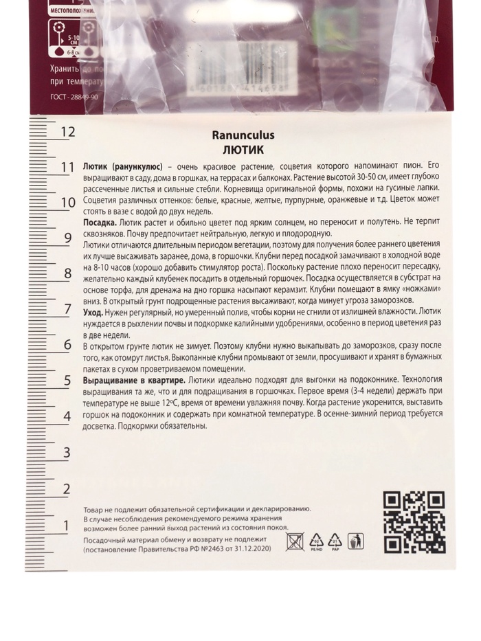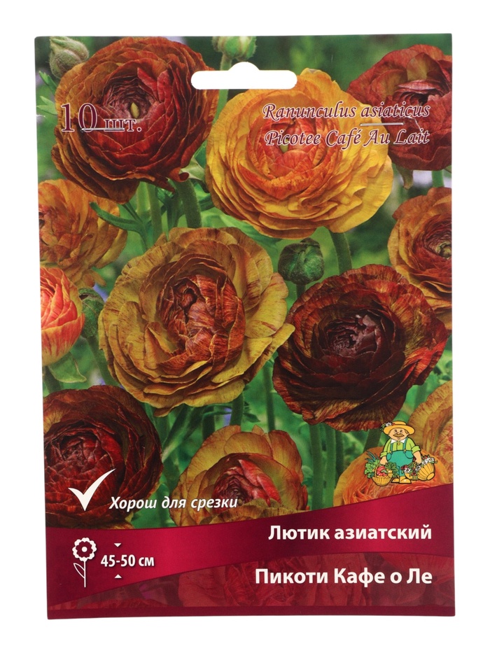 Лютик (ранункулюс) – необычайно красивое растение. Быстро набирает популярность, благодаря ярким цветам - "огонькам" и резной декоративной листве. Растение имеет глубоко рассеченные листья и сильные стебли. Соцветия среднего размера, могут быть самых разных оттенков, по форме напоминают пионы или маленькие розочки.Пикоти Кафе о Ле - высота растения 45-50 см. Эффектные цветы теплых золотистых оттенков серии "Пикоти", отличающейся изменением окраски краёв цветка по сравнению с основной окраской. Цветки полумахровые, по форме напоминают маленькие розочки. Окраска цветов варьирует от золотисто-желтых и бронзовых в основании цветка до тёмно-красного меланжа с кофейными нотками на краях лепестков. Лепестки шелковистые, блестящие. Цветут в течение месяца, после чего листва отмирает и растение уходит на покой. Изысканно смотрятся в цветниках и контейнерной культуре.Месторасположение: хорошо растет на солнечном открытом участке, но переносит и полутень. Растение не терпит сквозняков.Почва: нейтральная, легкая и плодородная.Посадка: Чтобы ускорить цветение лютика клубни можно подготовить заранее: их на несколько часов помещают во влажную среду (мокрые опилки или мох). Можно просто замочить в холодной воде или слабом растворе марганцовки. Каждую луковицу высадить в отдельный горшок и поставить в светлое место. Высаживать в открытый грунт, когда минует угроза весенних заморозков. Клубни помещают в ямку «ножками» вниз. Цветение начнется через 2-3 месяца.Уход: Регулярный умеренный полив, рыхление почвы и подкормки калийными удобрениями. Отцветшие соцветия вовремя удалять. В открытом грунте растение не зимует. В начале первых осенних заморозков корневища выкапывают и хранят в прохладном, затененном месте.Использование: Его выращивают в саду, дома в горшках, на террасах и балконах. Лютики идеально подходят для выгонки. Дает красивую срезку, цветок может стоять в вазе с водой до двух недель.
