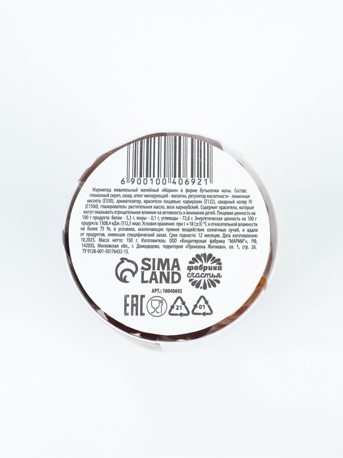 Состав: глюкозный сироп, сахар, агент желирующий – желатин, регулятор кислотности – лимонная кислота (Е330), ароматизатор, красители пищевые: кармуазин (Е122), сахарный колер IV (Е150d), глазирователь: растительное масло, воск карнаубский.