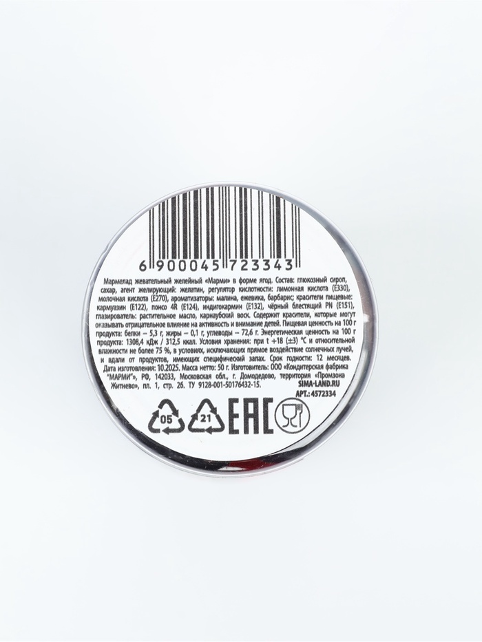 Состав: глюкозный сироп, сахар, агент желирующий – желатин, регулятор кислотности – лимонная кислота (Е330), ароматизаторы: «Малина», «Ежевика», «Барбарис», красители пищевые: кармуазин (Е122), понсо 4R (Е124), индигокармин (Е132), черный блестящий PN (Е151), глазирователь: растительное масло, воск карнаубский.
