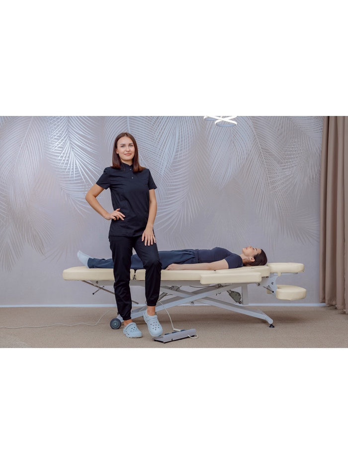 • Два электропривода — отдельная регулировка высоты (53–85 см) и центральной секции с возможностью создания положения «горка», что особенно важно при работе с позвоночником и мышечными цепями.