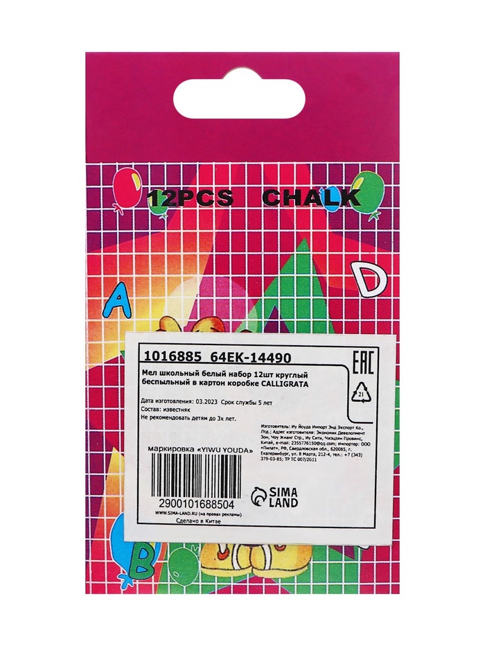 Мел школьный, белый, набор 12 штук, круглый, беспыльный, в картонной коробке