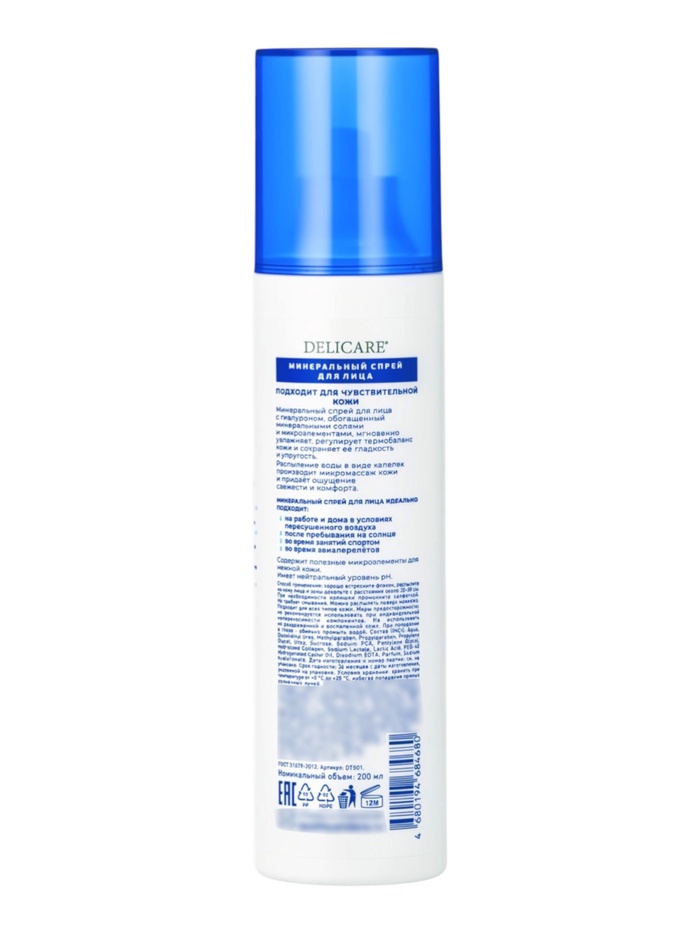 Минеральный спрей для лица Delicare объёмом 200 мл — это косметическое средство, предназначенное для ежедневного ухода за кожей в любой момент дня. Спрей представляет собой лёгкий мист, обогащённый гиалуроном и минеральными солями, которые помогают увлажнять кожу и поддерживать её естественный баланс.