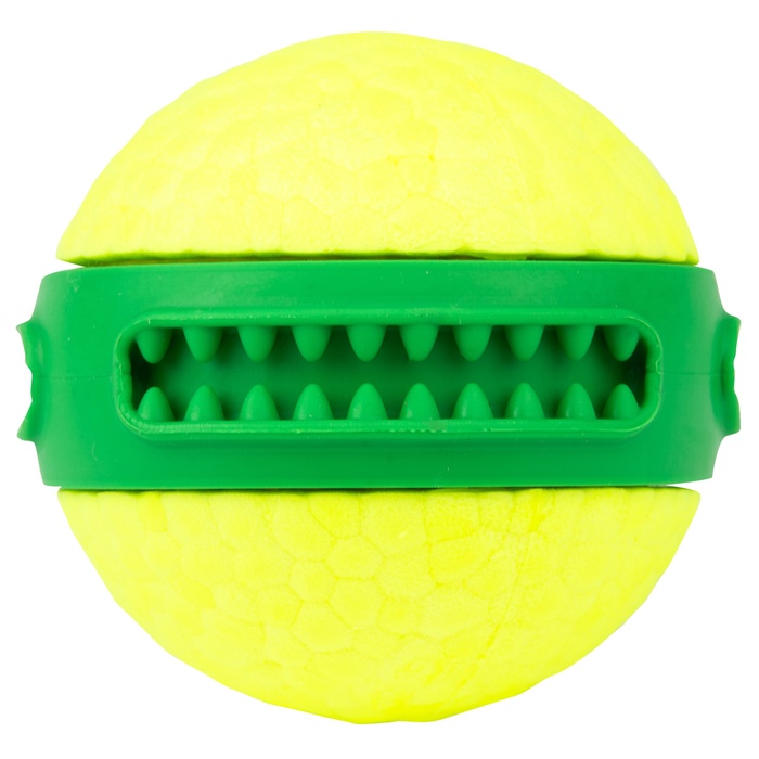 - Рельефные «зубцы» — для захвата и массажа: поверхность покрыта мелкими выступами, которые улучшают сцепление в пасти и мягко стимулируют дёсны при жевании. Это тактильный акцент для собак, которые любят покатать мяч в зубах перед броском.