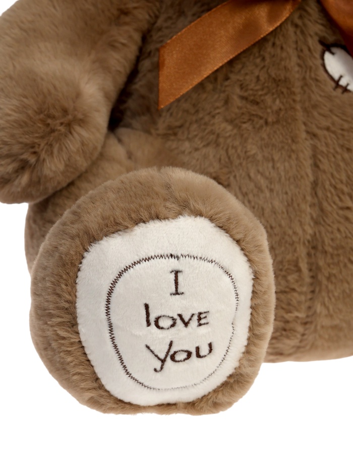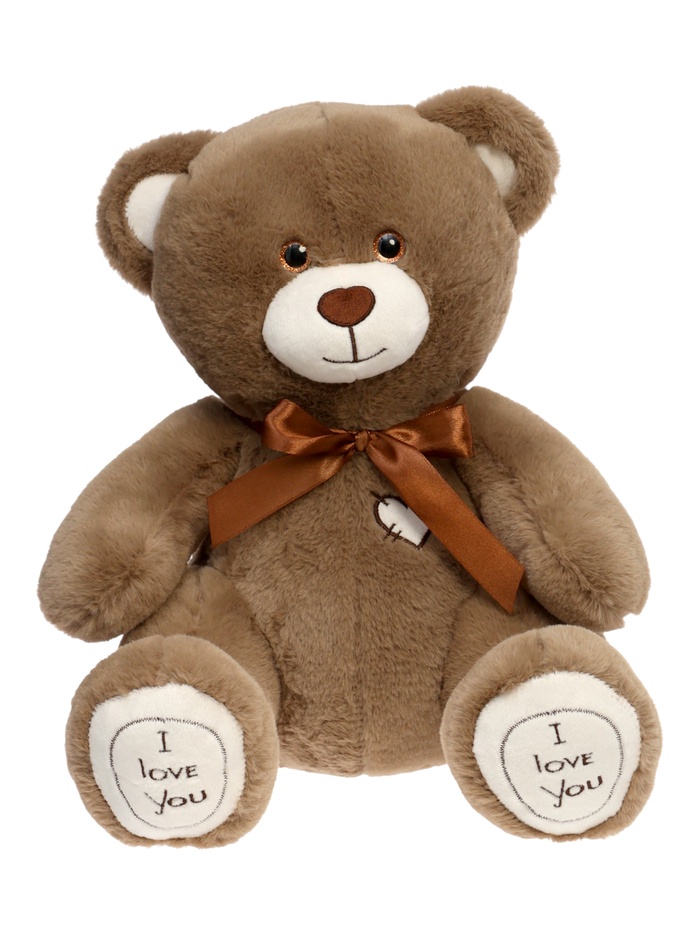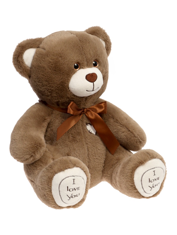 Мягкая игрушка «Медведь Фил» — уютный классический медвежонок в тёплом коричневом оттенке с аккуратным атласным бантом. Спокойный цвет, округлая форма и трогательные надписи на лапках создают образ доброго, домашнего друга, который ассоциируется с заботой и теплом.