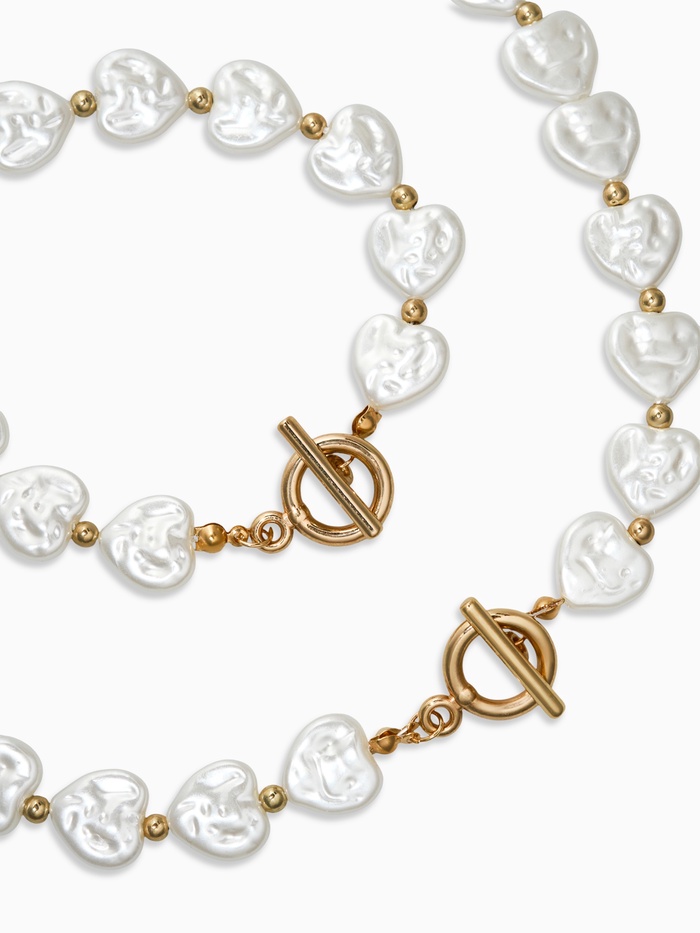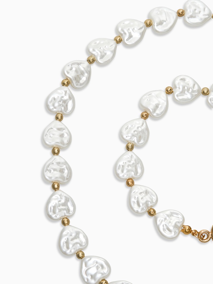 Позвольте представить удивительное сочетание шелковисто-белого жемчуга и сияющего золота — комплект колье длиной 40 см и браслета длиной 18 см. Отточенная форма жемчужин в виде капель придает изделию особую грациозность и элегантность, а металлический каркас дополняет ансамбль элегантным мерцанием.