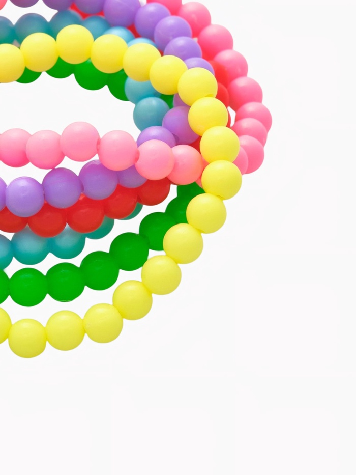 Набор из шести разноцветных детских браслетов с пластиковыми бусинами представляет собой яркий аксессуар для девочек. Каждый браслет без застёжки и длиной 7 см подходит для комфортного ношения на детском запястье.