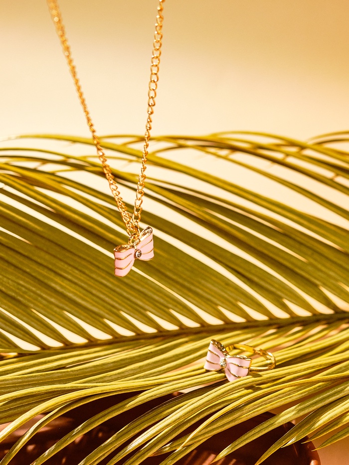 Изящный комплект украшений в нежном розовом оттенке создан специально для маленьких модниц, ценящих утончённость и стиль. В набор входят кулон и кольцо с золотистой фурнитурой, украшенные эмалью и сверкающими стразами, что придаёт образу лёгкость и праздничное настроение.