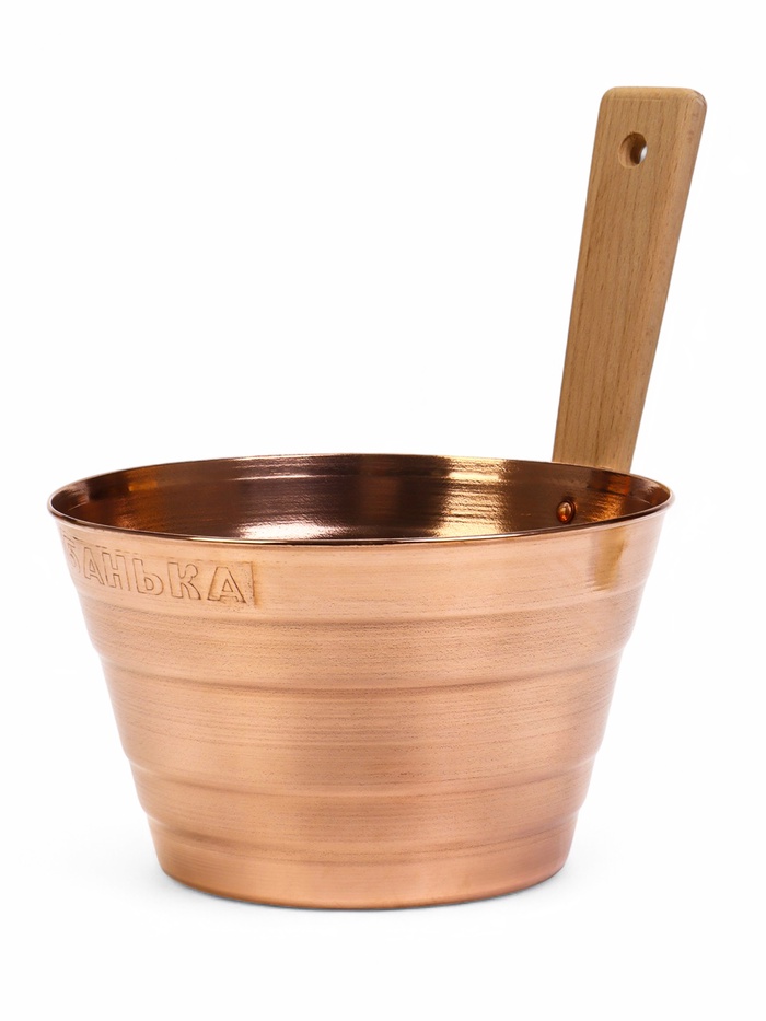 - Медный ушат объемом 5 литров: Классический ушат из меди не только удобен, но и долговечен. Его теплоемкость и устойчивость к коррозии делают его идеальным для использования в парной. Медь известна своими антибактериальными свойствами и способностью поддерживать стабильную температуру воды, что важно для любителей традиционной русской бани.