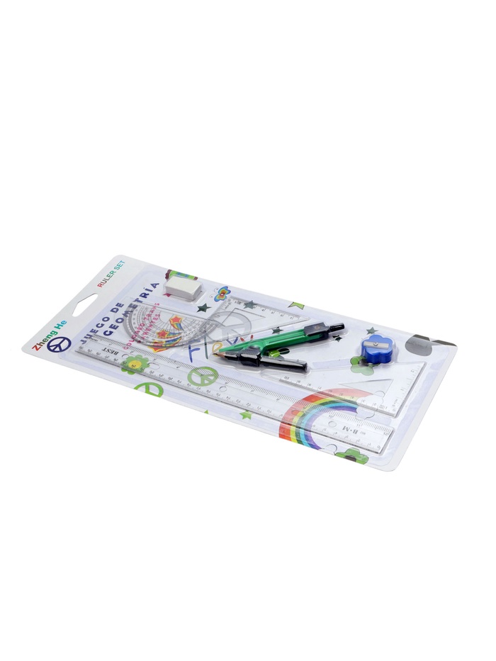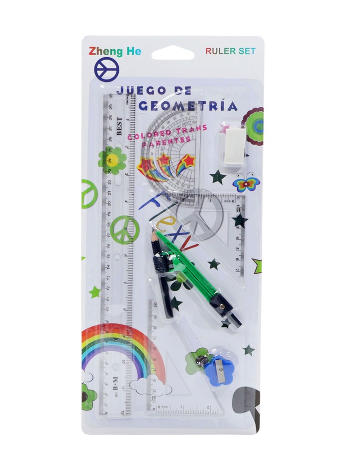 Набор геометрический: линейка 30 см, 2 угольника, транспортир, точилка, ластик, циркуль