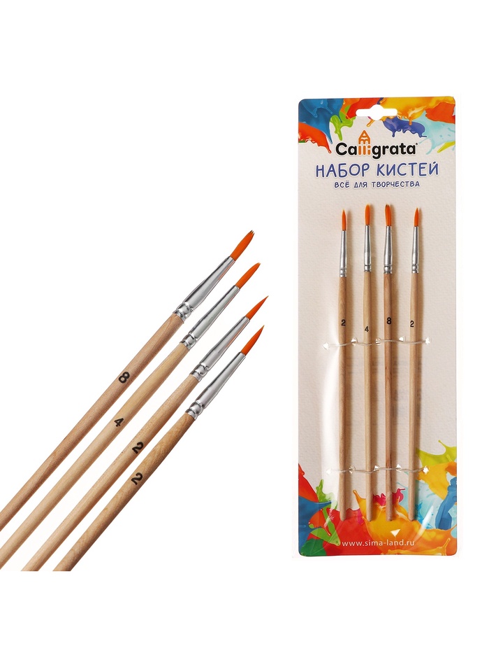 Набор кистей для рисования, синтетика, 4 штуки: № 2, 2, 4, 8, круглые, деревянная ручка, международный размер
